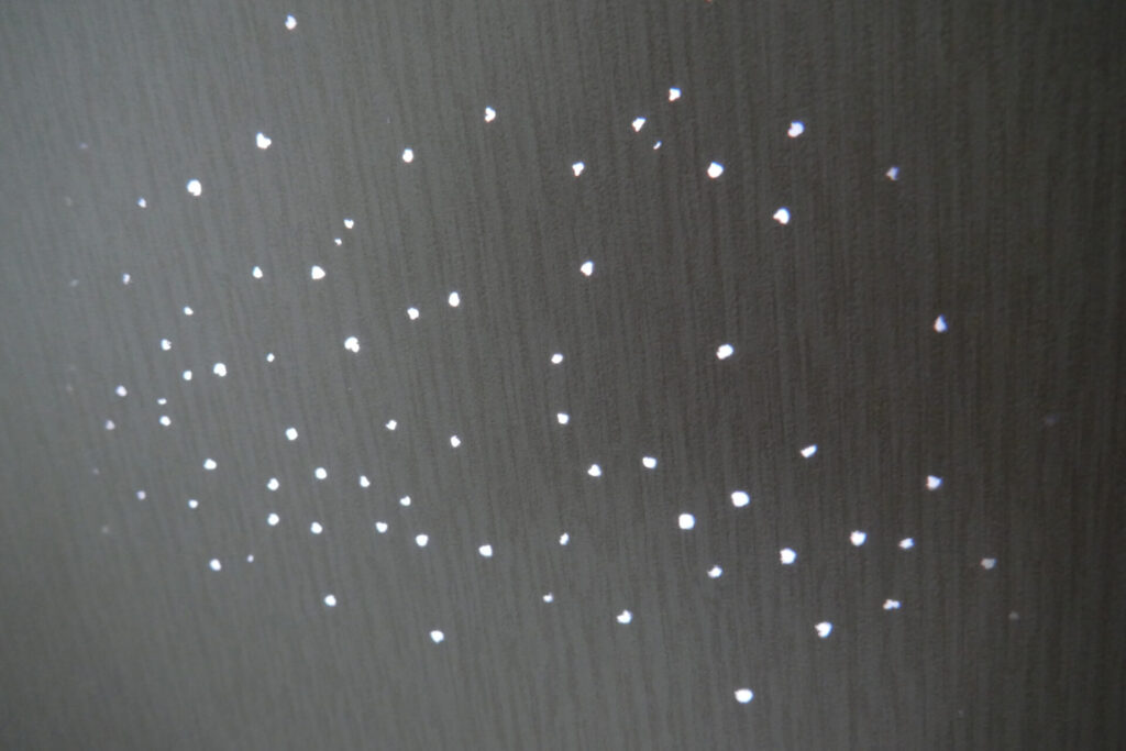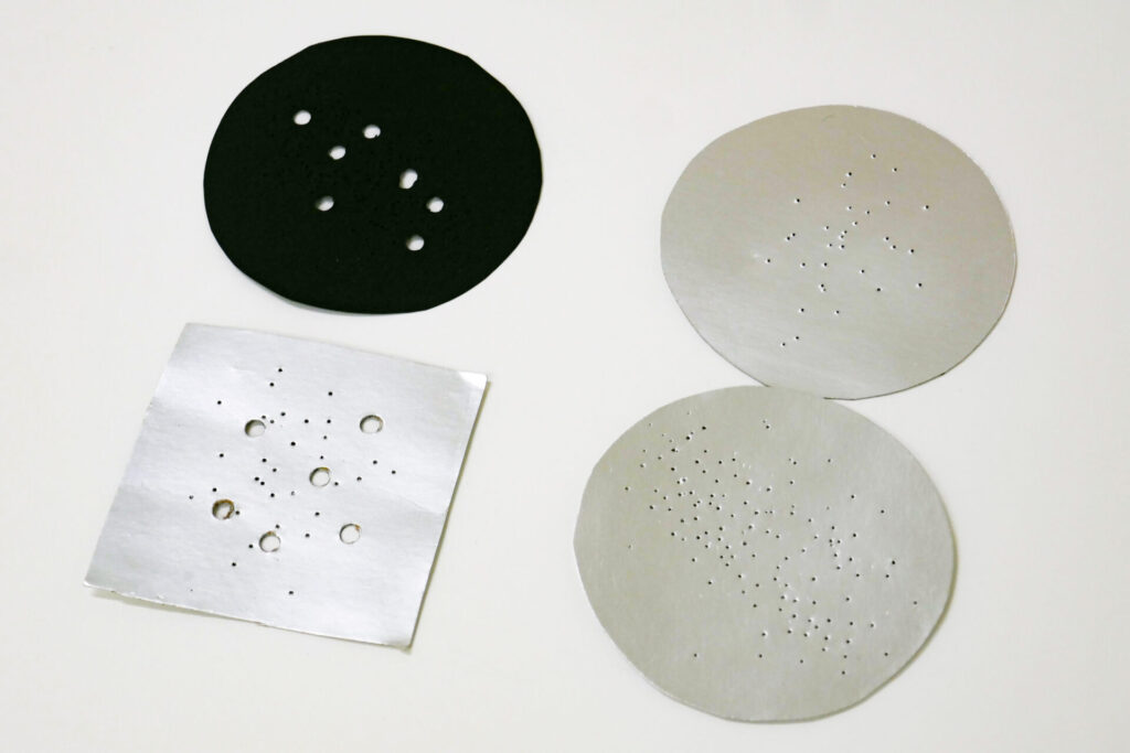 アルミホイルに針または目打ちで小さいピンホールを開けます。穴が大きすぎると穴を通して当たる光の星やハートなどのマスク効果が効かなくなります。(意図的にやるのはアリ)光が壁に当たったときの様子を想像しながら、適当に開けていってください。