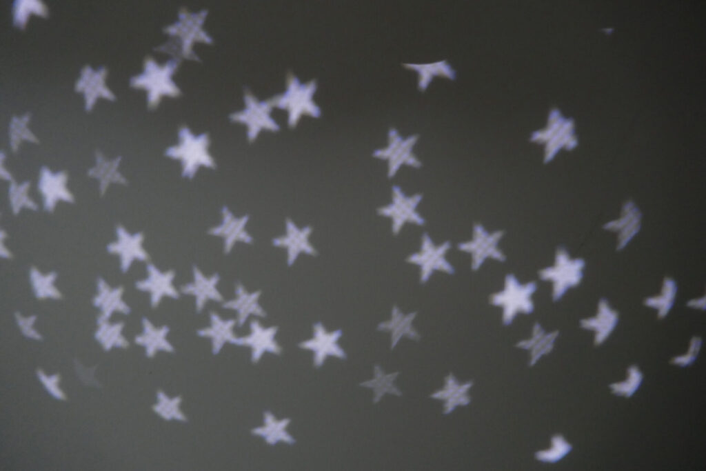 これを徐々にフォーカスアウト(ピンボケ)していくと…あら不思議、細かい光の粒が星型に変わりました。