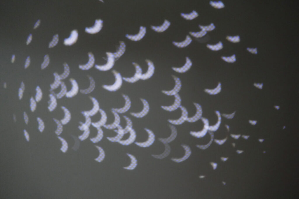 これに似た自然現象で部分日食のとき三日月型の光が地面にいっぱい現れますよね。光の通過の順番は違いますが、多分原理は一緒だと思います。
