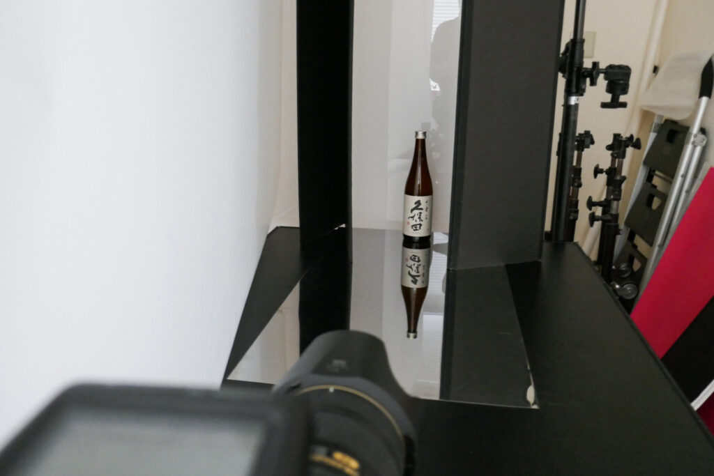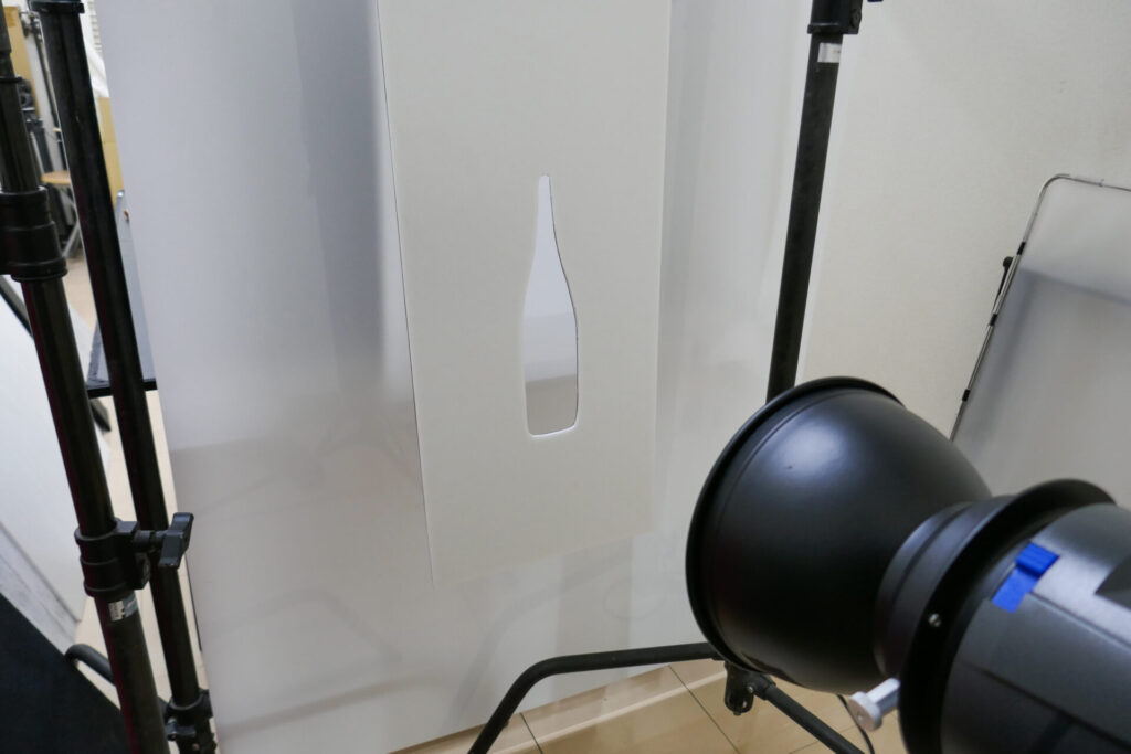 具体的に言うと、例えばバックライトの写真を撮るときには、ボトルの両サイドを黒いボードなどで囲い、漏れたバックライトの光でセッティングしたトレペや部屋の壁などの映り込みをシャットアウトします。