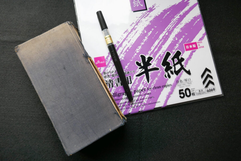 習字用の道具で文字を書くのも趣があっていいですが、今回は筆ペンと半紙でやってみることにします。