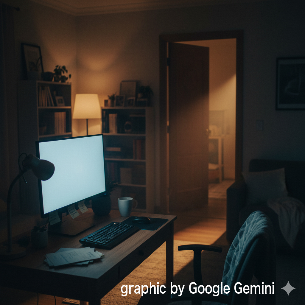 ちょっとだけ空いたドアから隣の部屋の明かりがスリットのようにパソコンの一部に当たっている画でしょうか、それとも間接照明の薄暗いスポットライトがぼんやりと部屋を照らしていて調度品が薄っすらと見える画でしょうか?