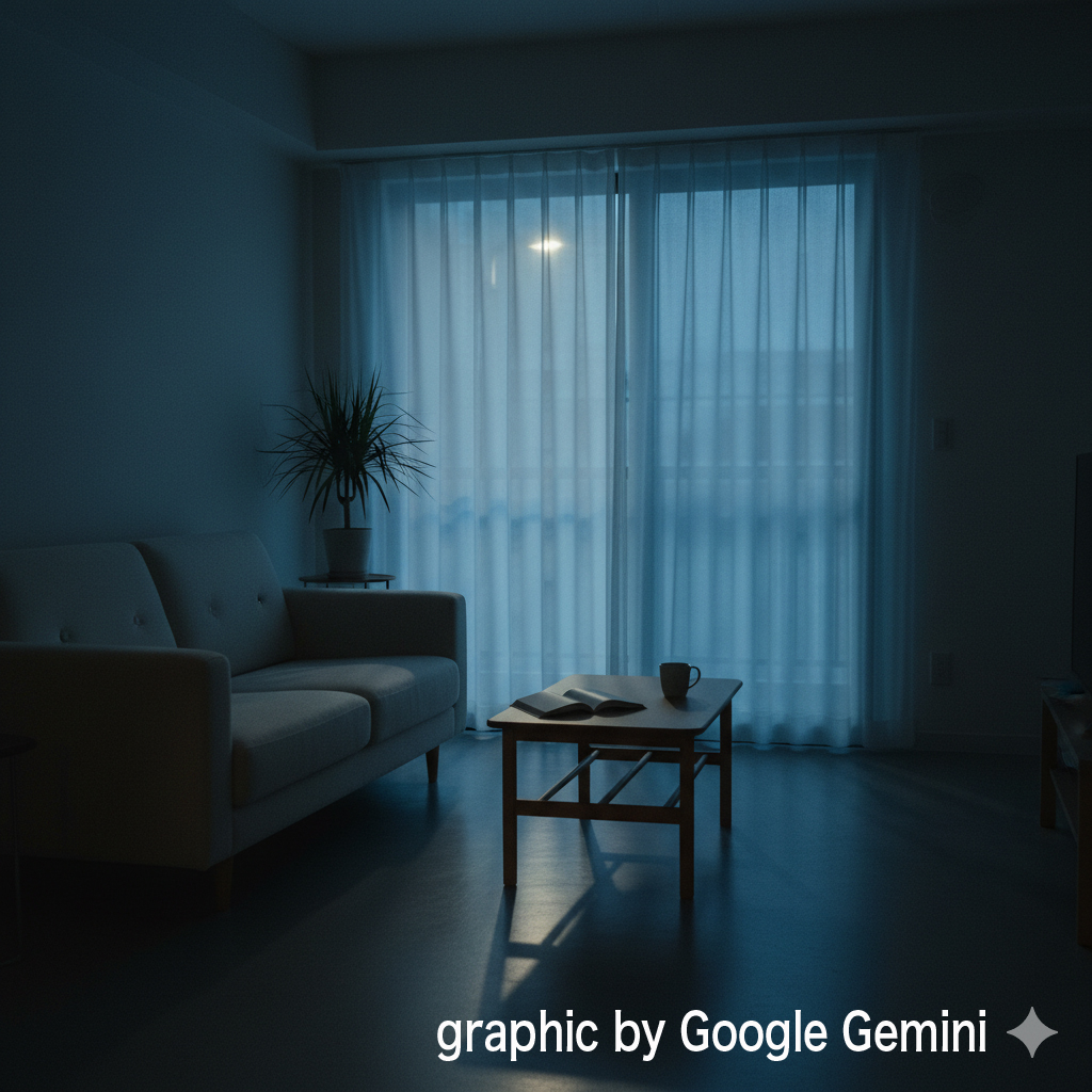 するとその光は、夕暮れの空の光がカーテンに当たっているだったり、隣のマンションの通路の明かり、街灯に照らせれた隣の家の壁の反射光だったりするはずです。
