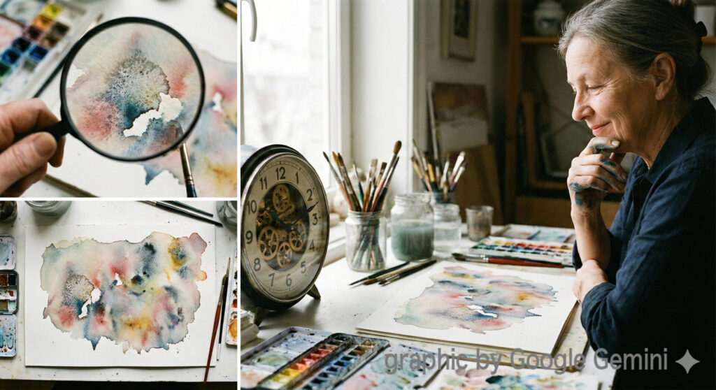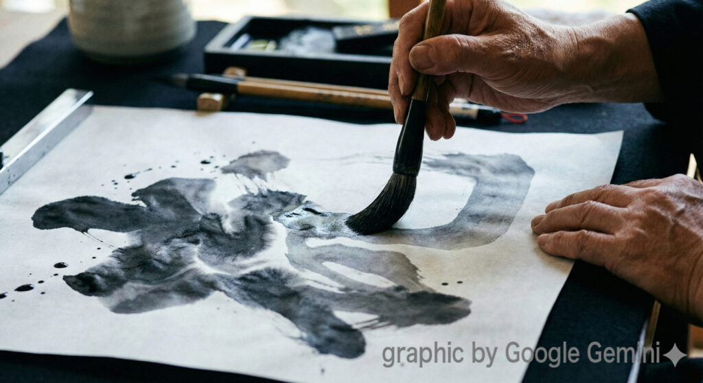 アートのカテゴリーで言うと書道、水彩画、などは、筆の意図的な運びに加え、紙に浸透する墨や絵の具の滲み具合であったり、かすれを利用して画面構成をします。
