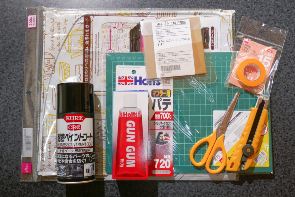 その他、カー用品の耐熱塗料、耐熱パテや、固定用の素材として100均のレンジガードを用意しました。