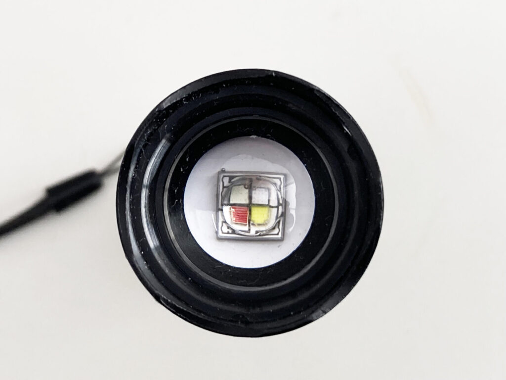 発光部を見てみると4つのLEDチップらしきものが見えるので、切り替えて1色ずつ発光するんだと思います。