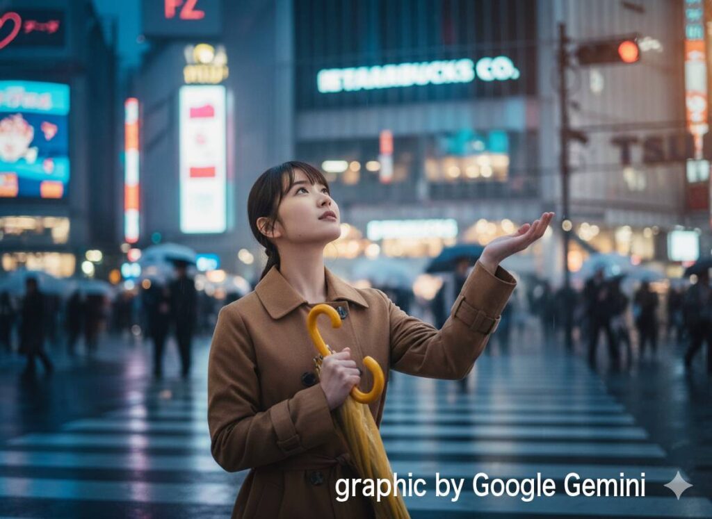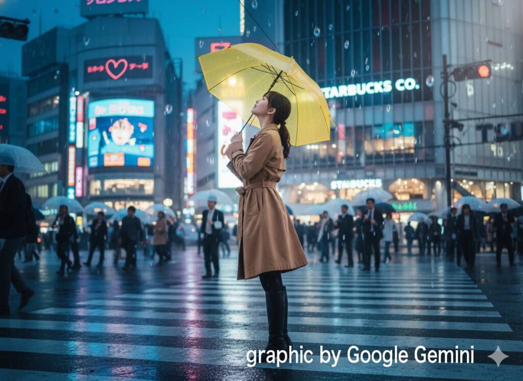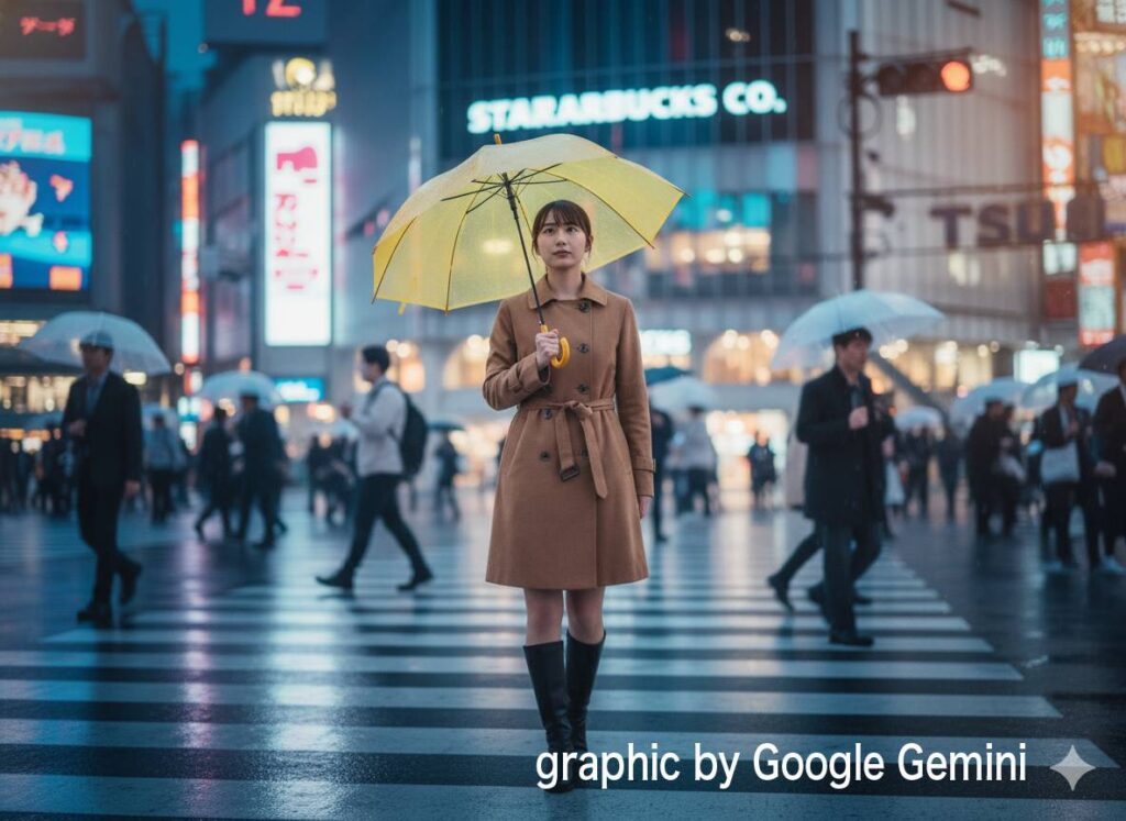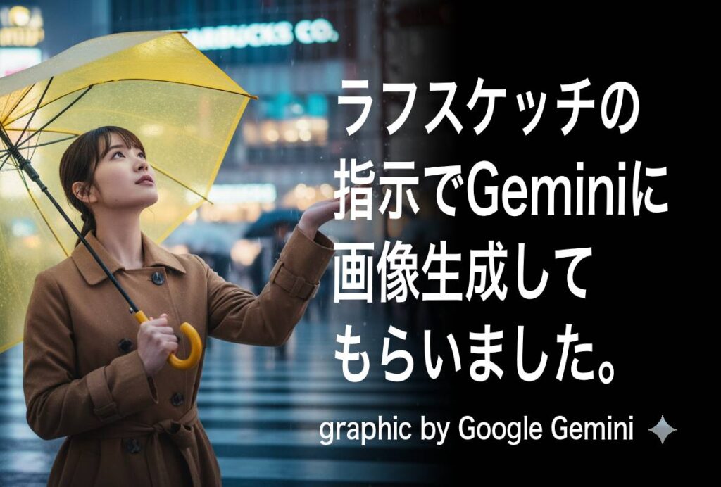 『ラフスケッチから画の意図を読み取り、複雑な描写が可能か試したいので、雨の渋谷交差点で傘をさす女性の画像はどうでしょう?』
