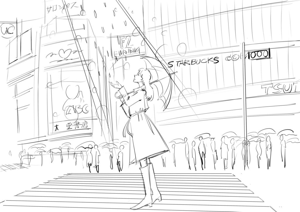 まずGoogleマップのストリートビューで、ハチ公前あたりの画像をキャプチャーして街並みの資料収集、それから傘を持った女性のイラストに取り掛かりました。