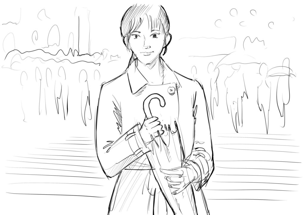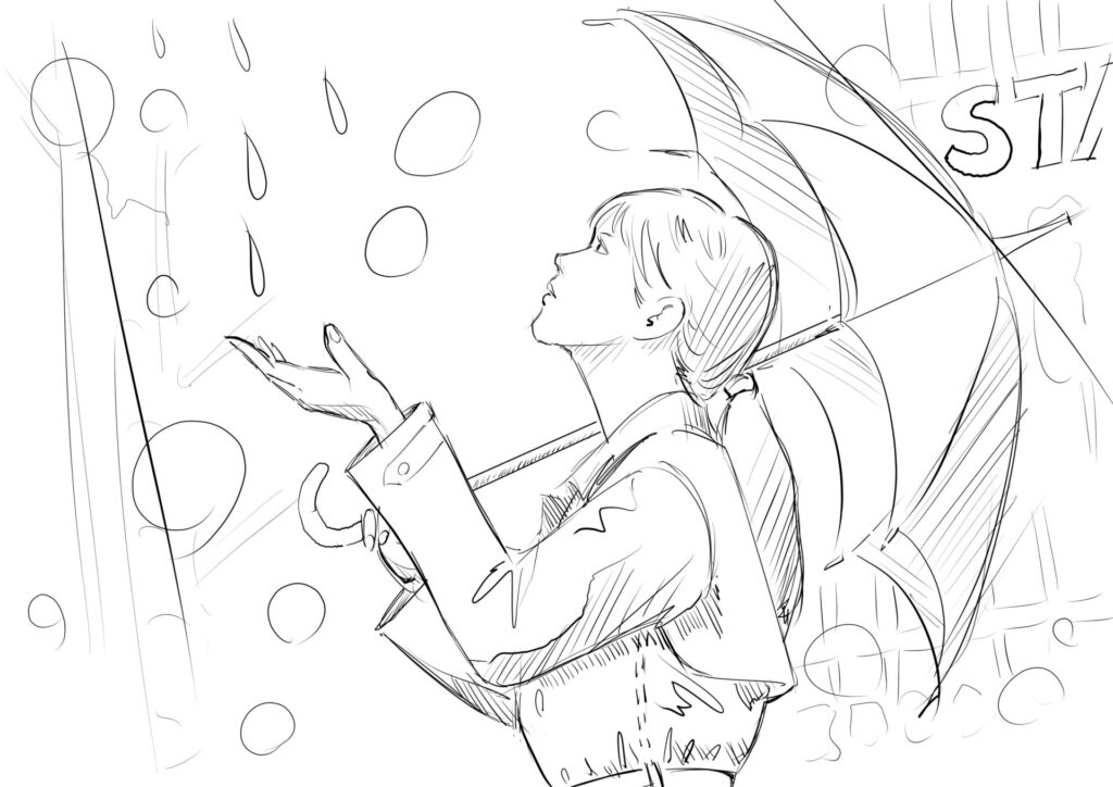 さっき傘を真横にするのと、手を差し伸べるディテールの表現に失敗したので、再チャレンジも兼ねます。