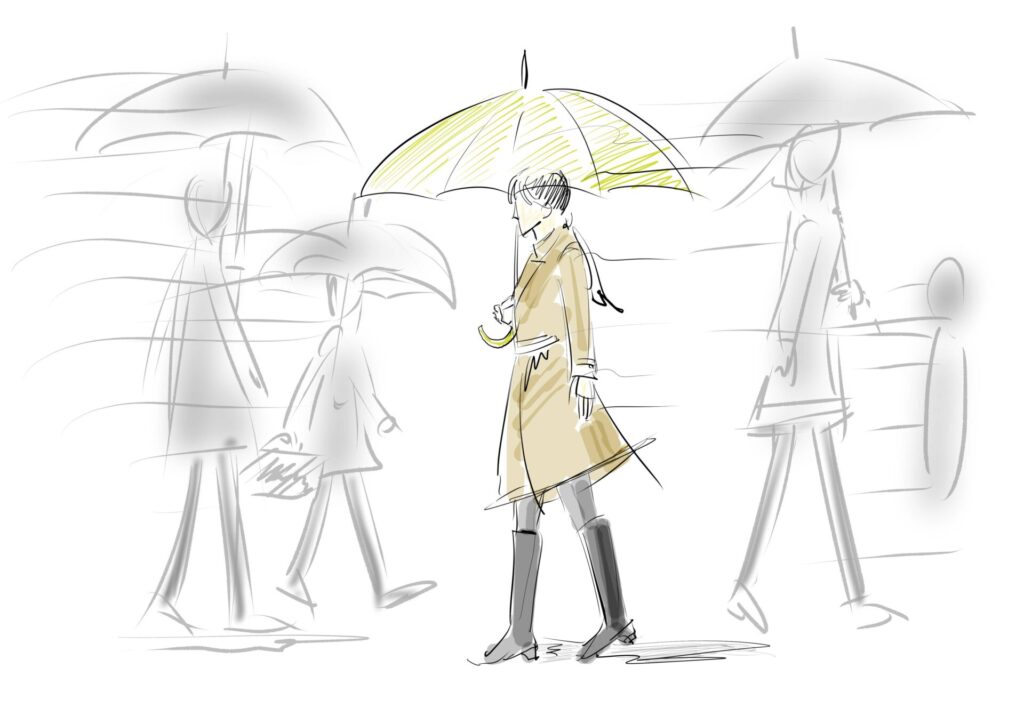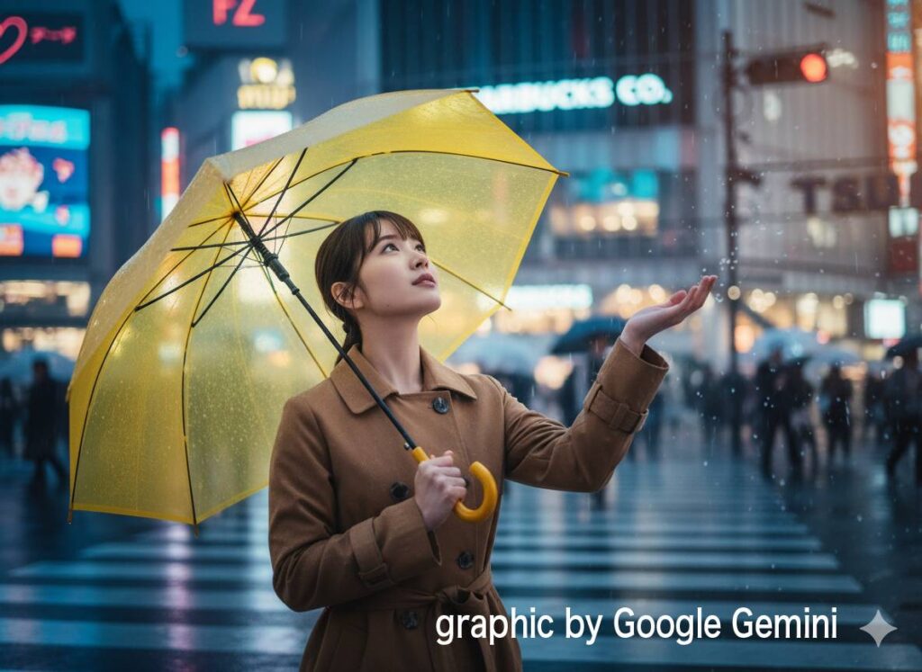 後はコート傘の色などをすり合わせる程度、その後英語でプロンプトを作成してくれて、画像生成の準備完了です。で、できた画像がこちらです。