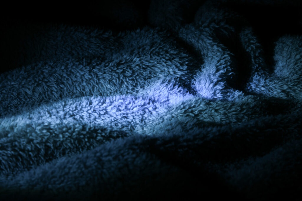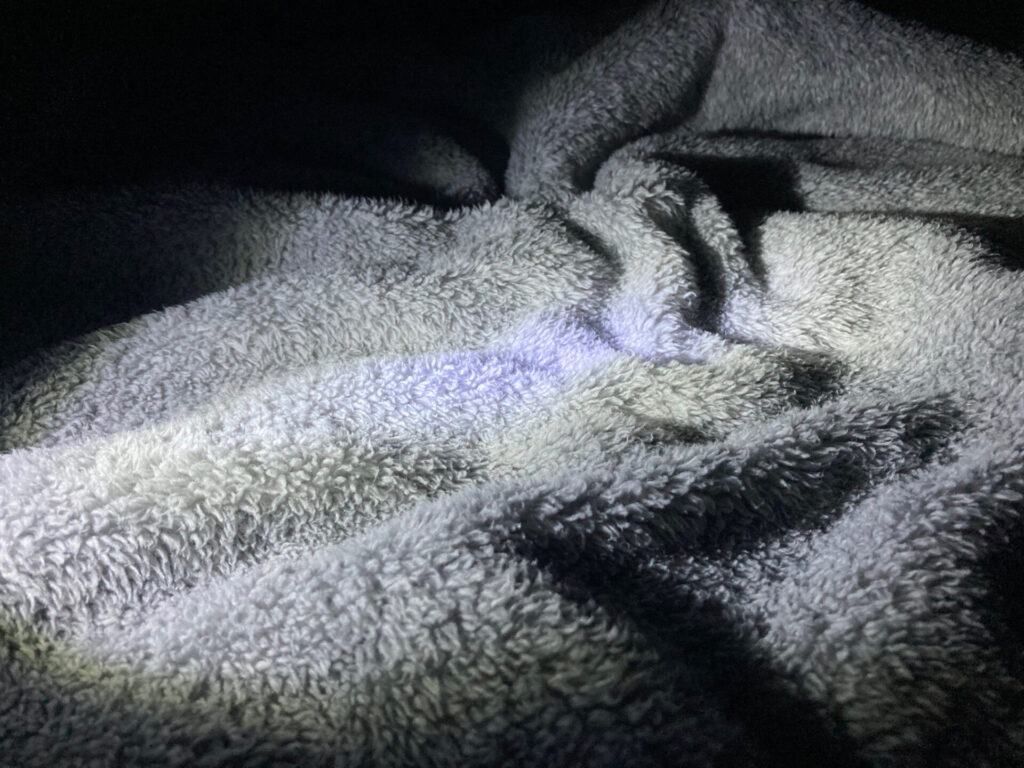 懐中電灯を使い、暗室で撮ったときの毛布のディテールの描写を比較します。予想ではスマホの描写の方が潰れた感じになる予想です。