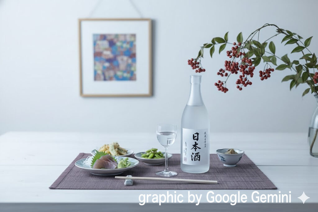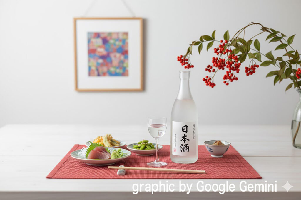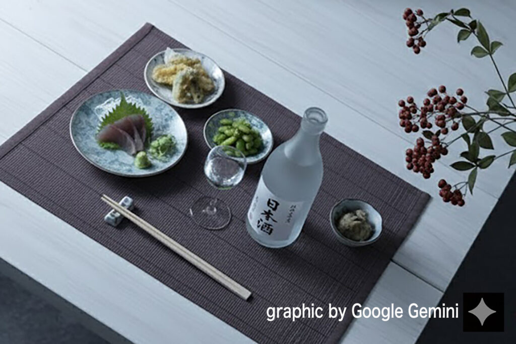 例えば「明るい和風モダンの食卓」をゴールに日本酒のボトルを主役にしてテーブルフォトのセットを組むとしましょう。